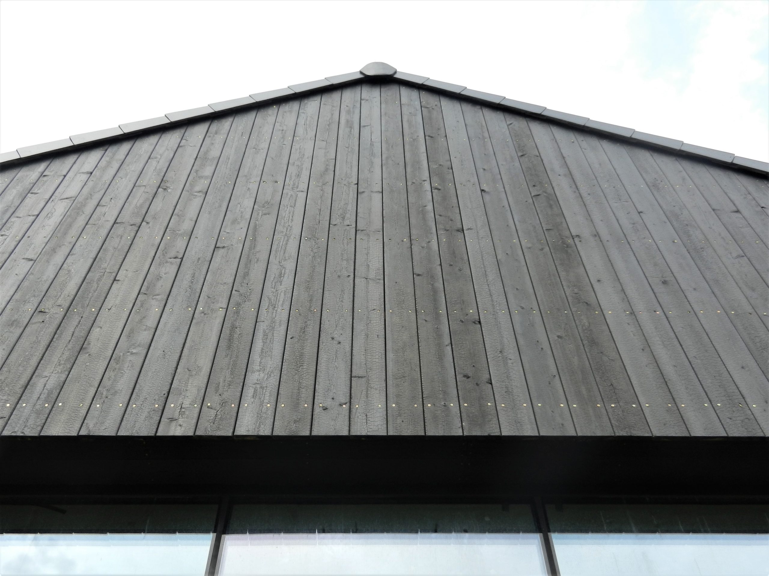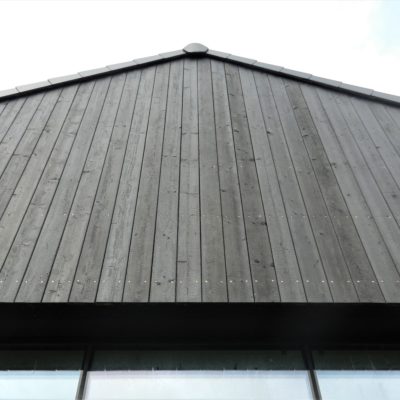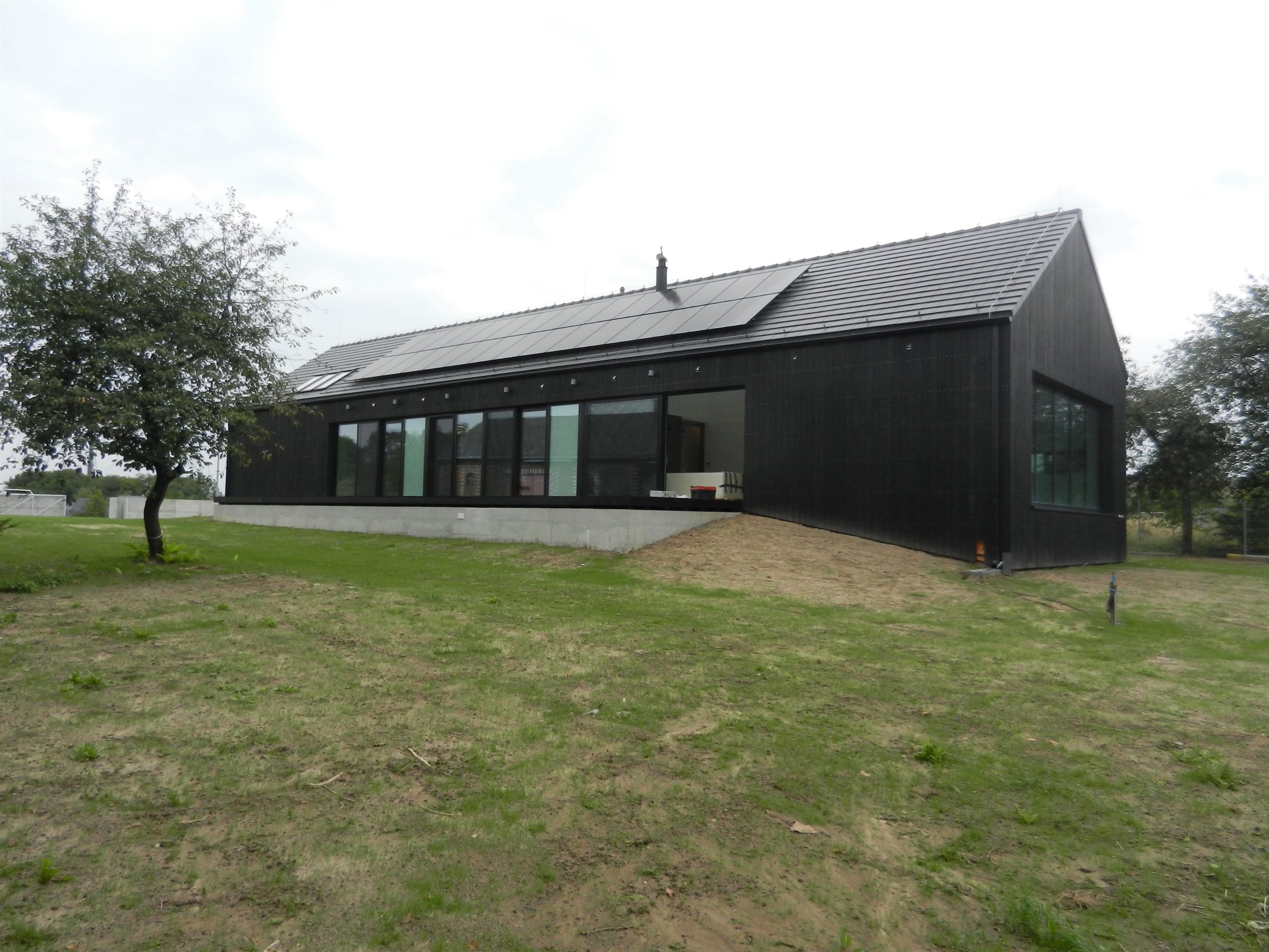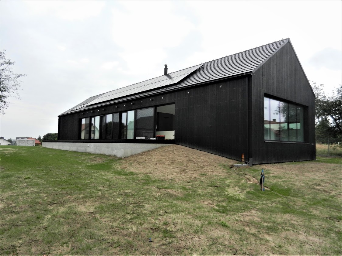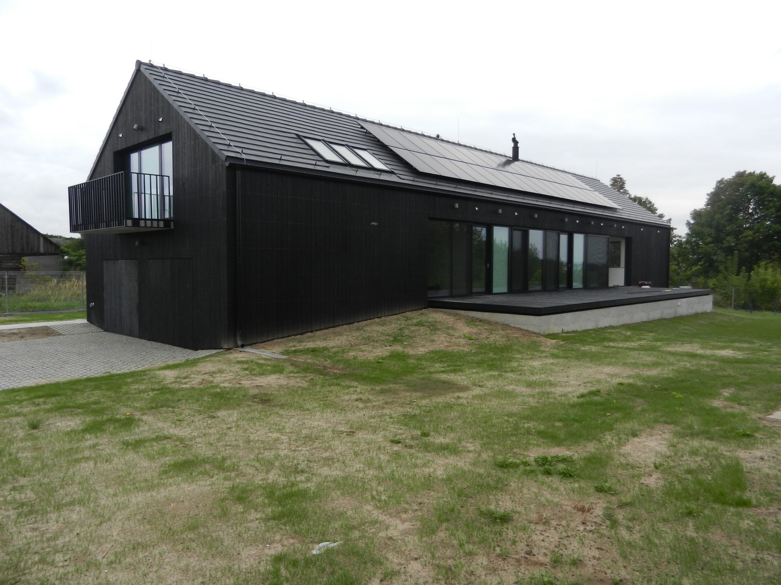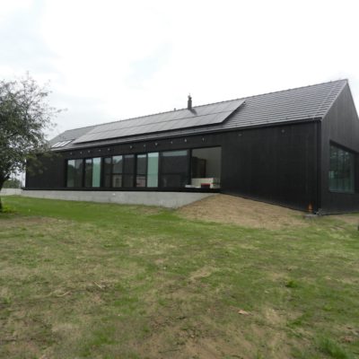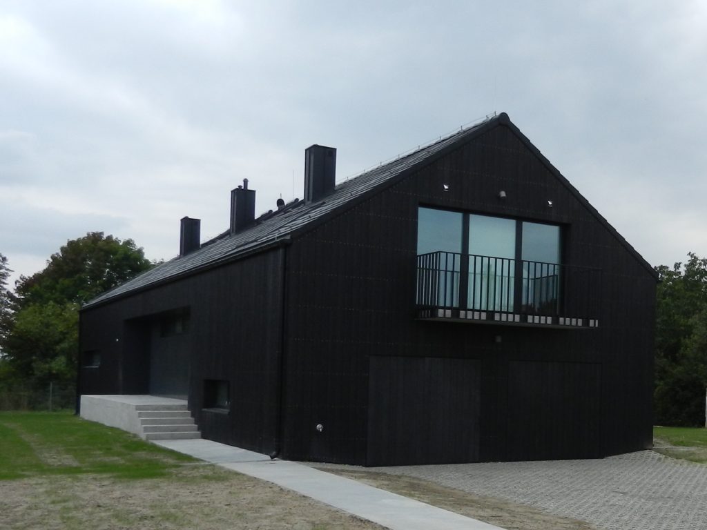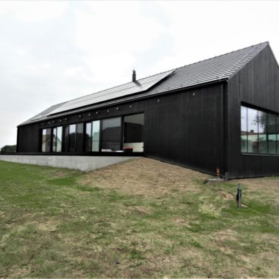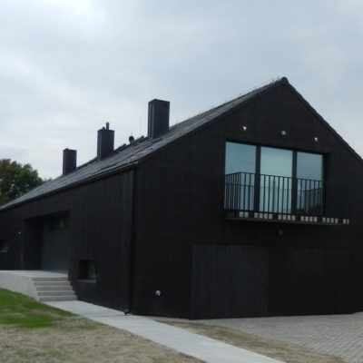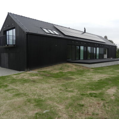 The house designed in the trend of modern barns. A simple block combined with a black front and a large amount of glazing creates the ultra modern arrangement.