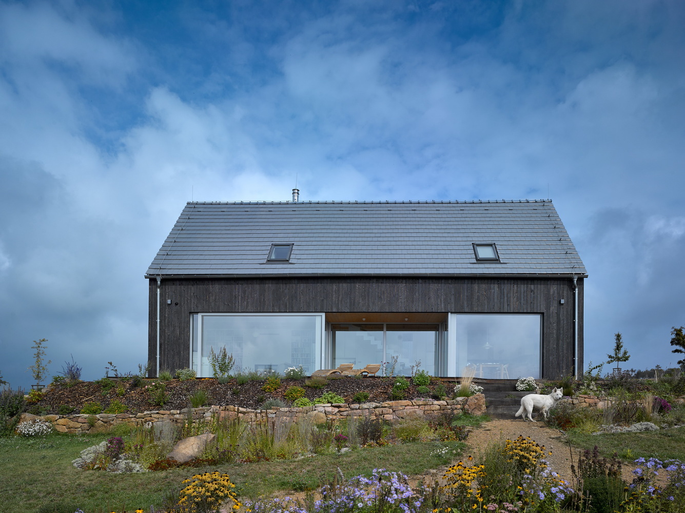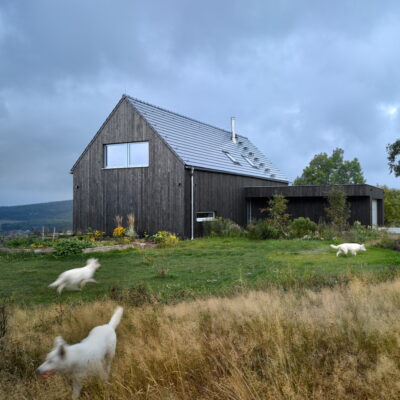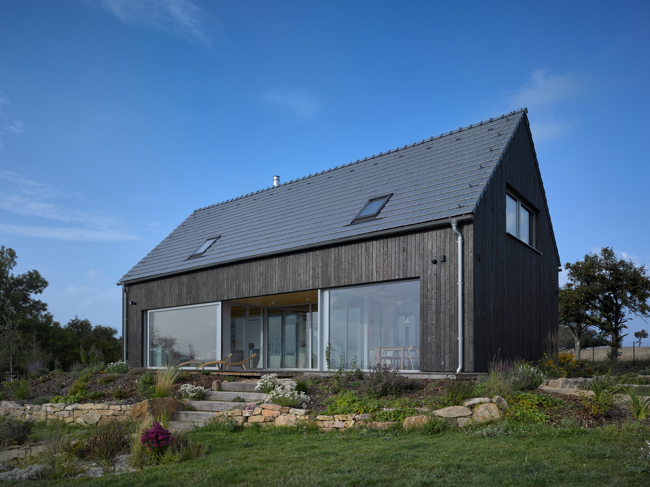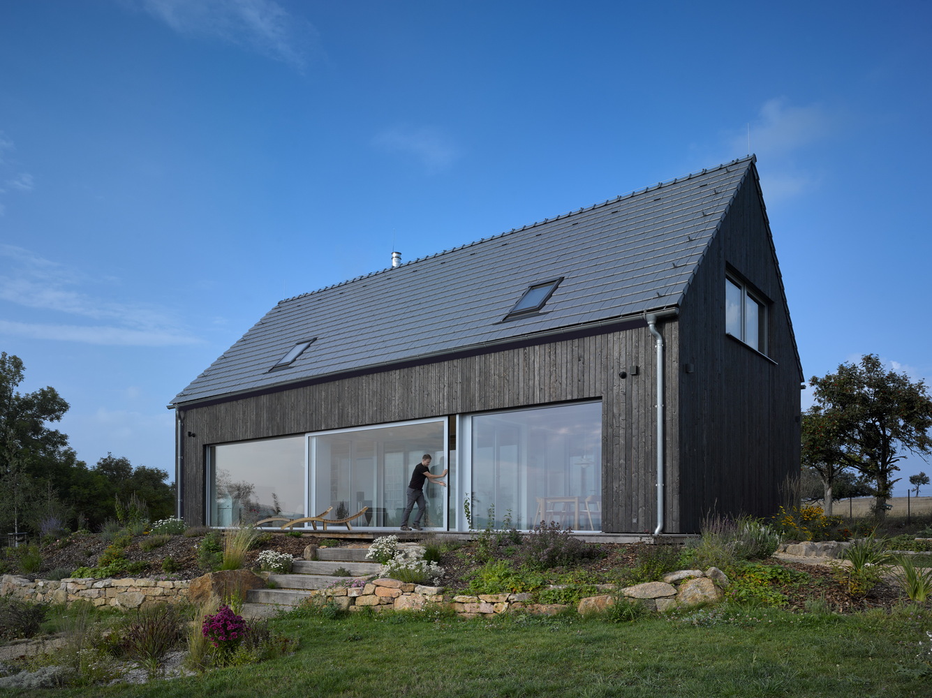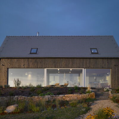 The project refers to the recently fashionable barn style. The economical shape, the gabled roof, the large stained glass and the modern details in the form of burnt boards create a unique visual effect.