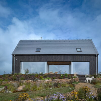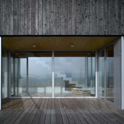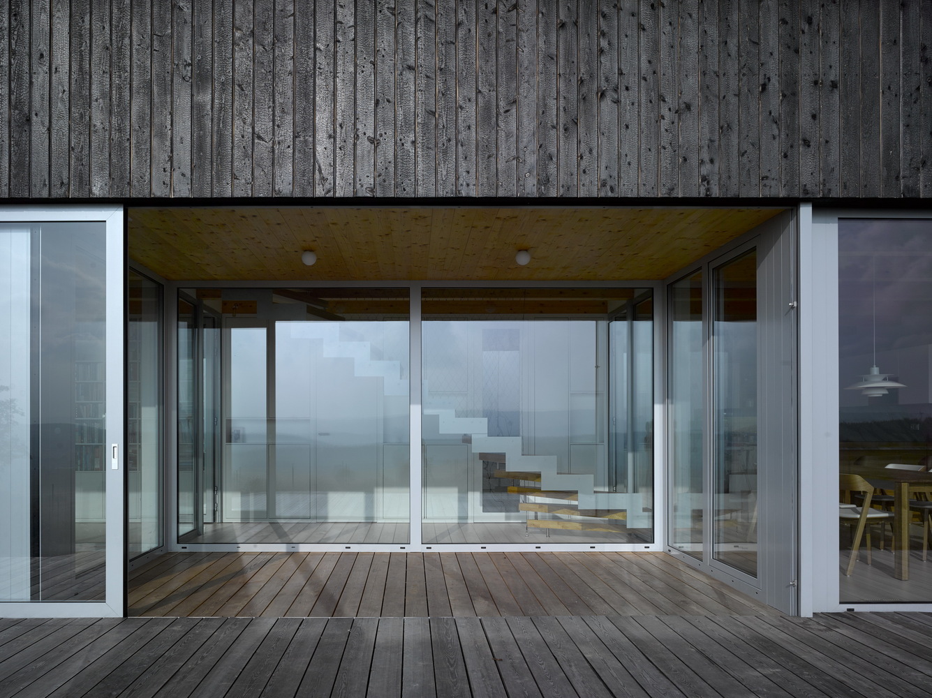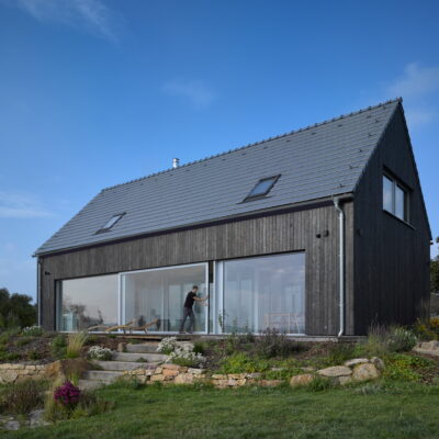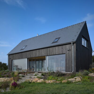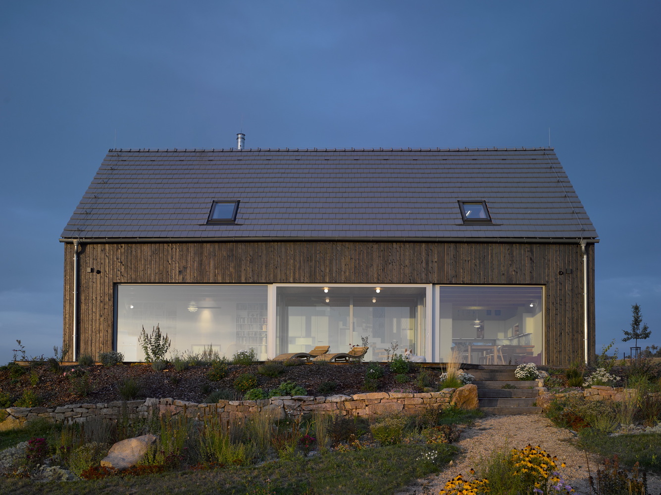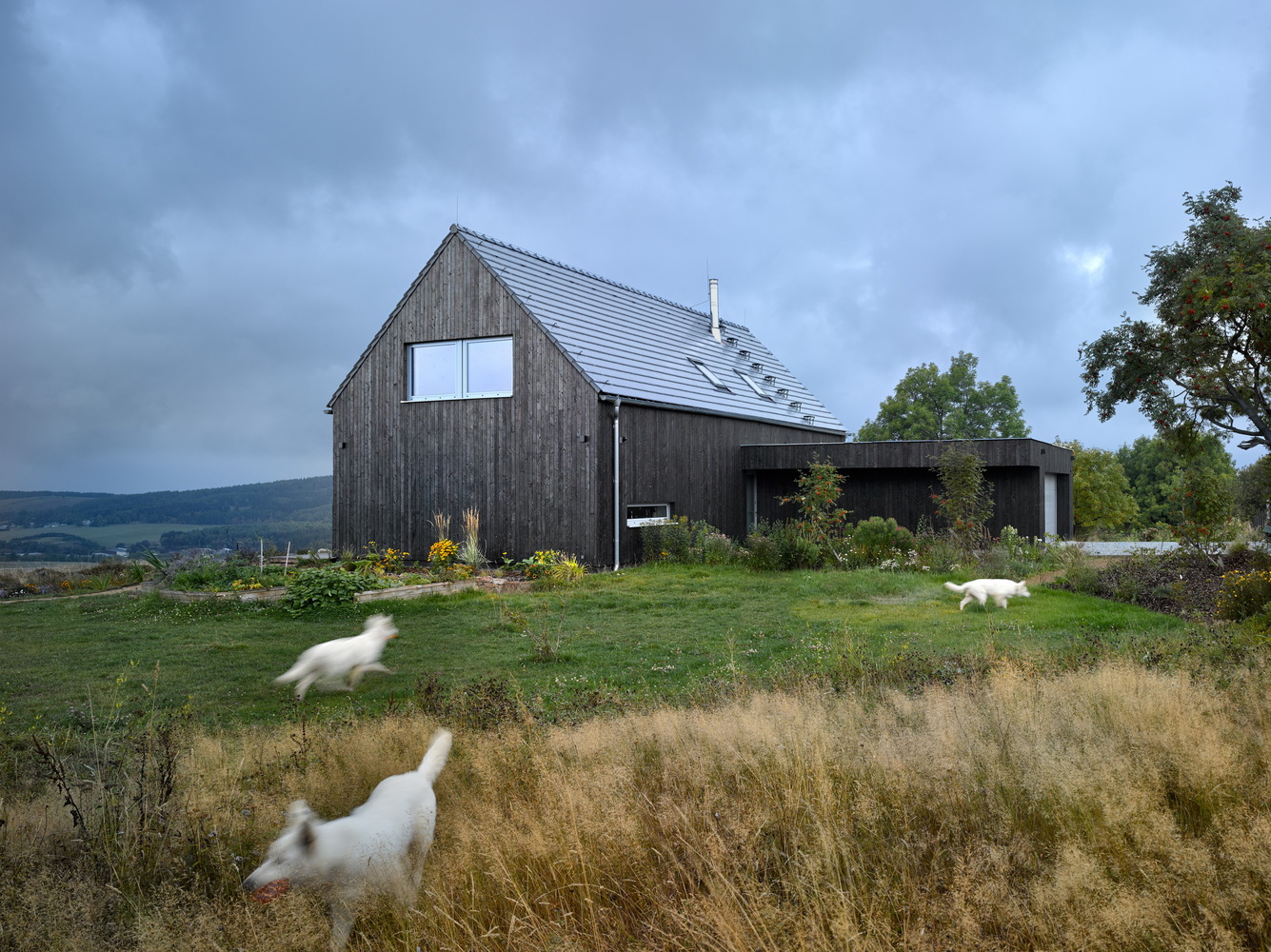 The project refers to the recently fashionable barn style. The economical shape, the gabled roof, the large stained glass and the modern details in the form of burnt boards create a unique visual effect.