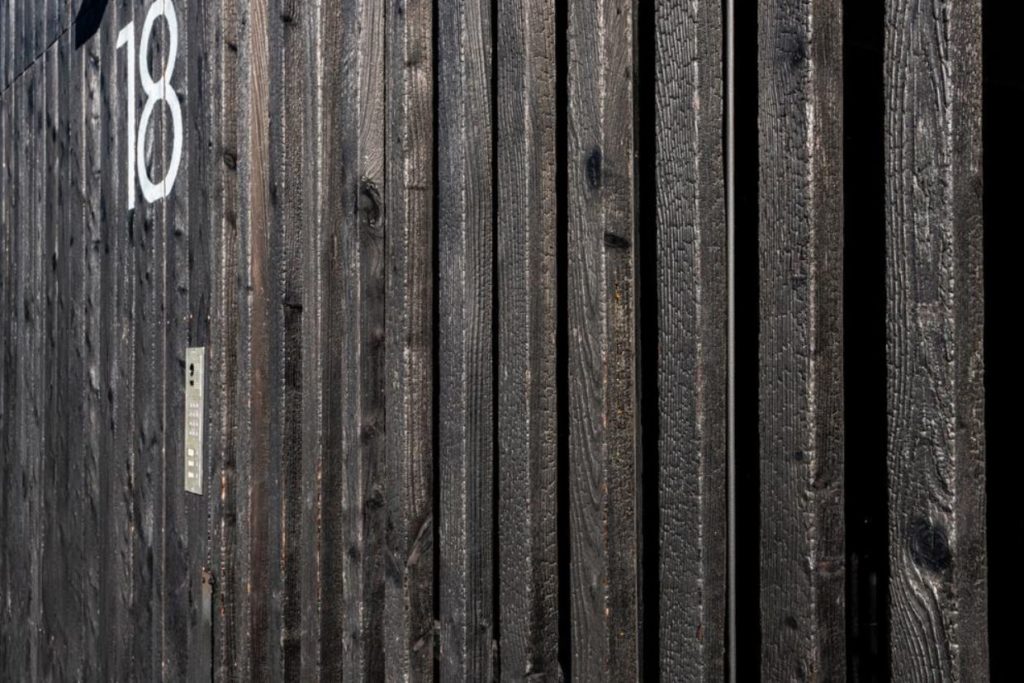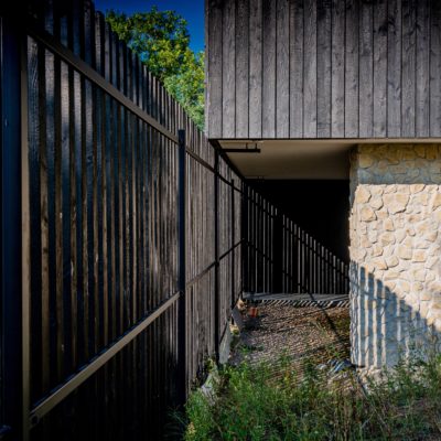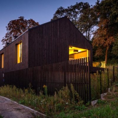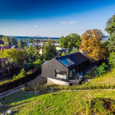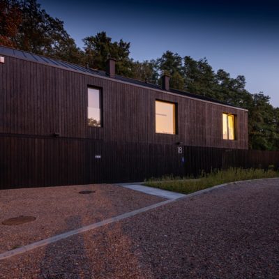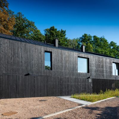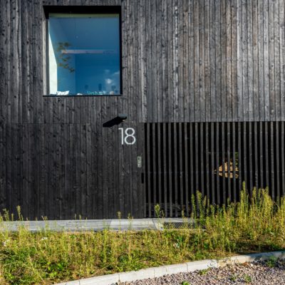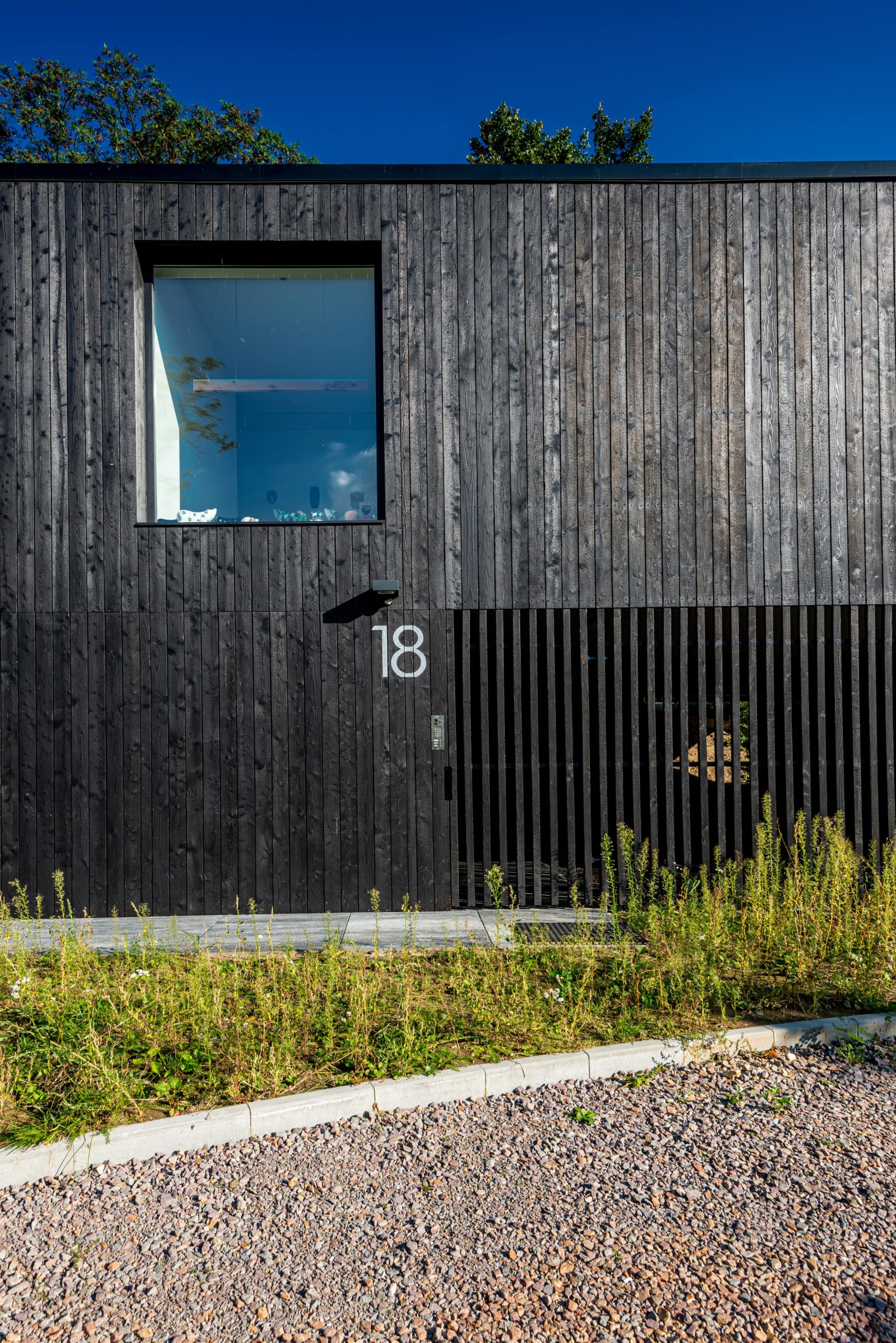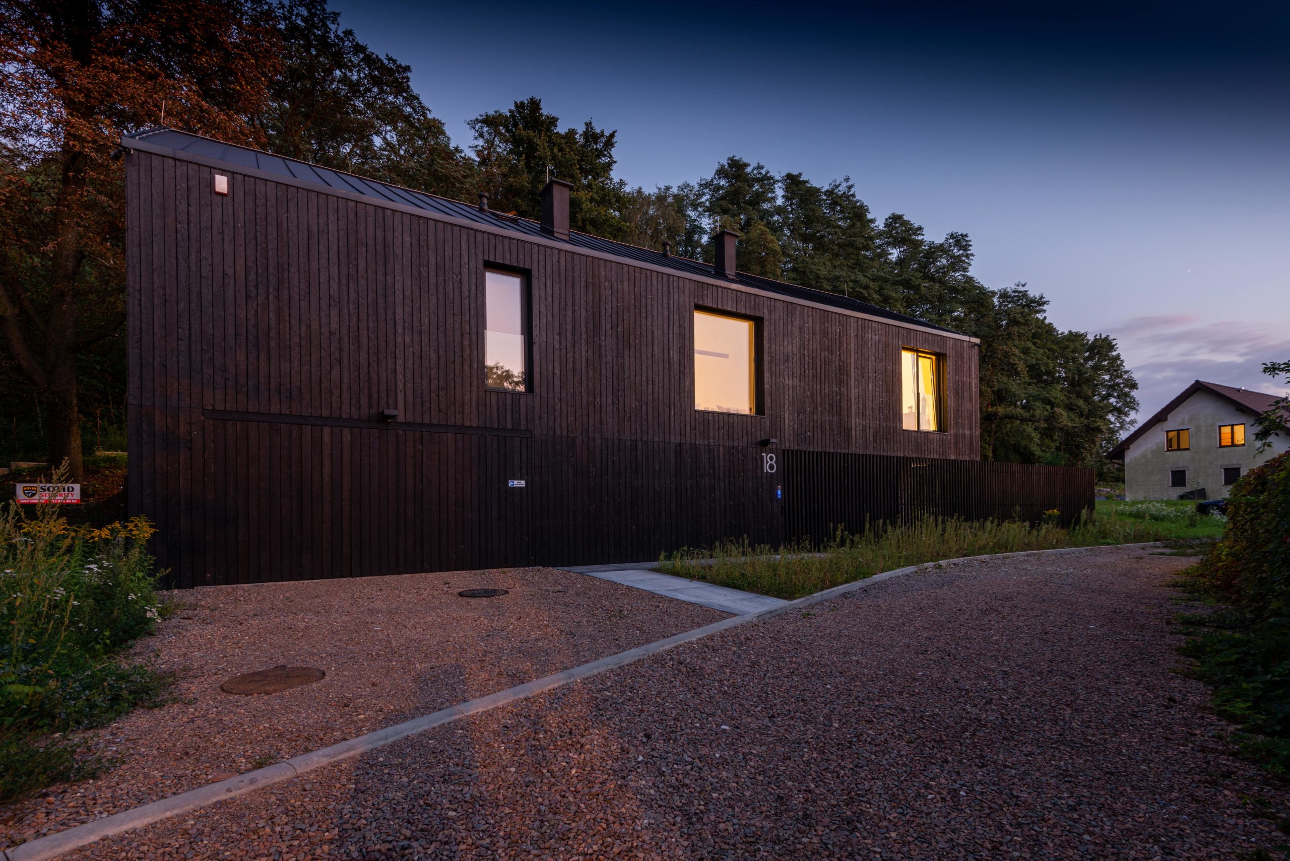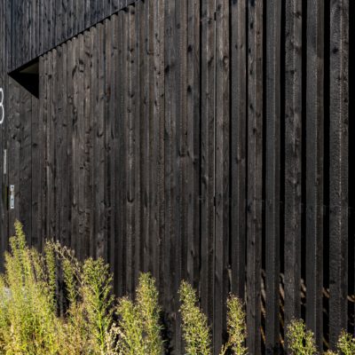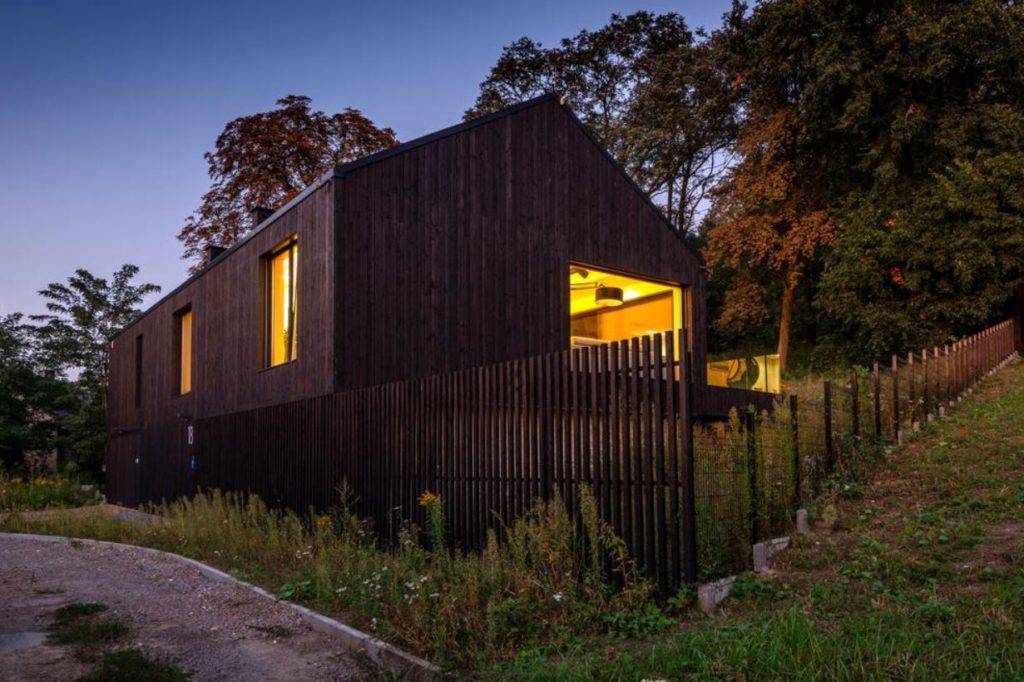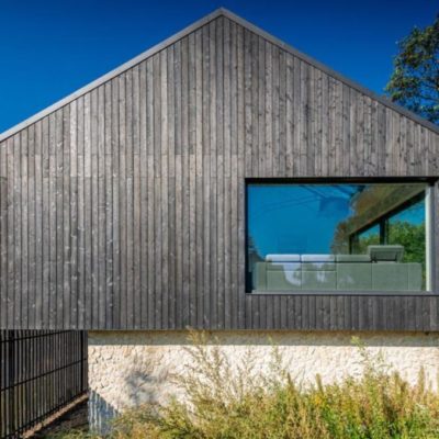 The house is built in the style of a modern barn. The facade was made entirely of larch boards with a Natural Grain finish. An interesting decorative element are the openwork wooden elements.