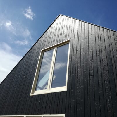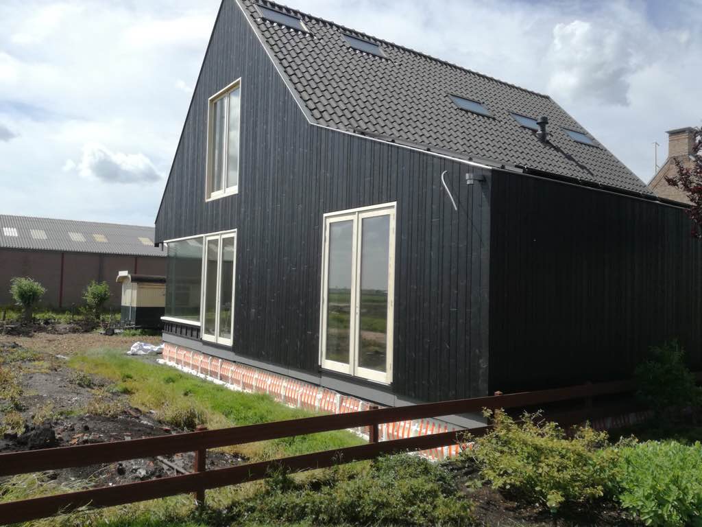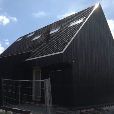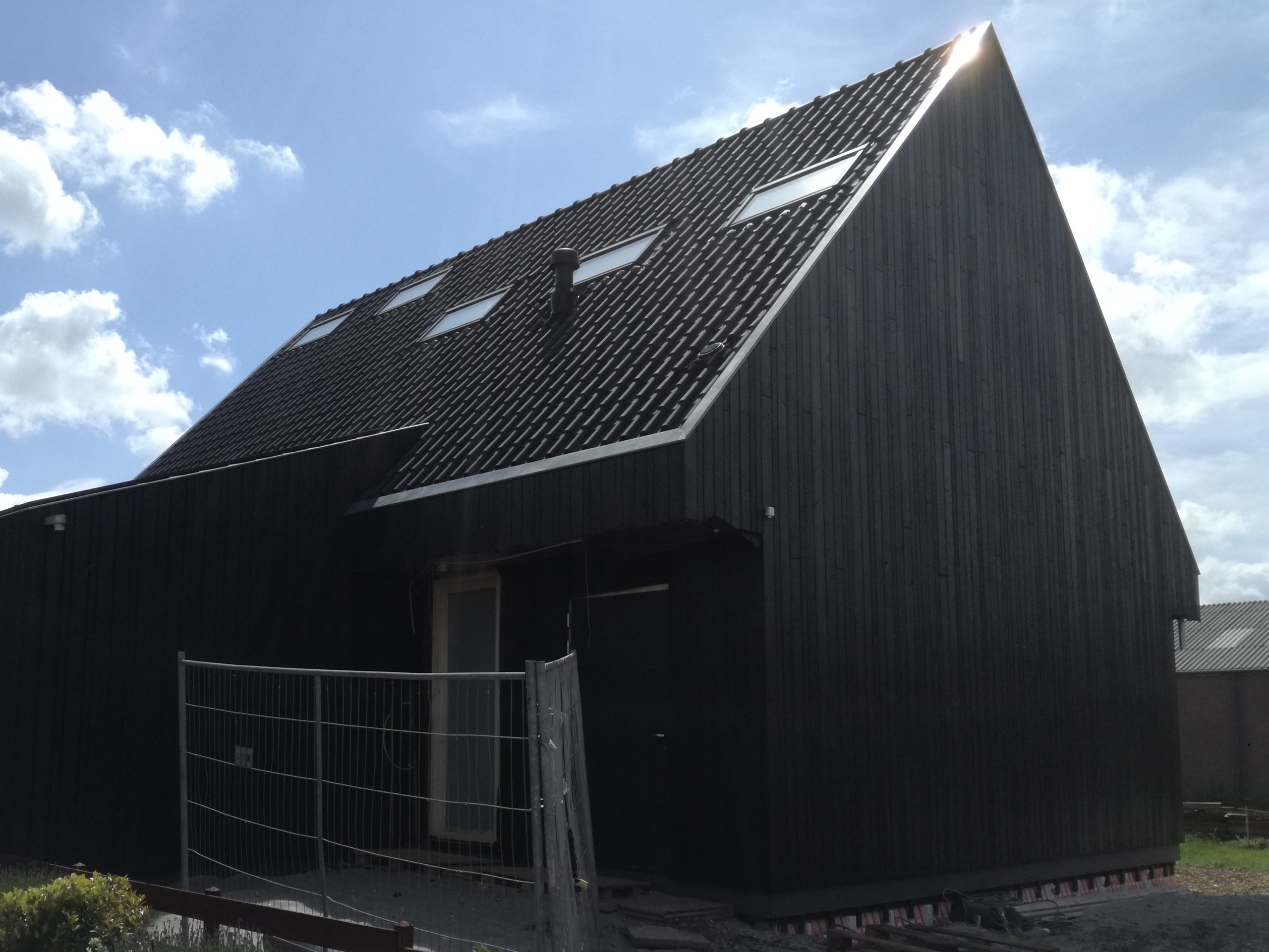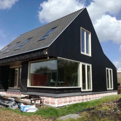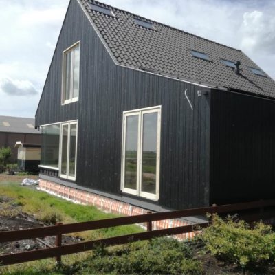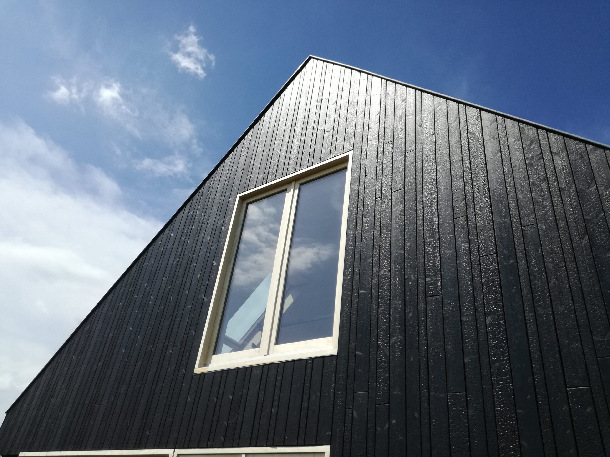 Stylowy dom w Holandii. Na elewacji zastosowano deski wykonane w technice Shou Sugi Ban. Ciekawym elementem są białe profile okienne kontrastujące z czarną elewacją.